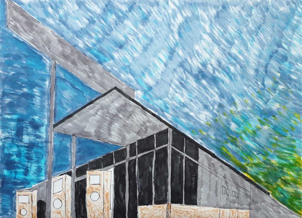 For my final drawing, I once again went with mixed media but went way out of my comfort zone when it came to one of my mediums; ketchup. I wanted to try this as I had heard Ruscha has experimented with food and condiments before, (as well as blood but I thought that was a bit extreme) and found the experience to be enlightening, albeit quite unsuccessful. I started by lightly sketching out the linework in pencil and quite liked this, working with perspective and shape. I used watercolour pens for the first time for most of the drawing and found that it gave me a different effect to Ruscha’s work, as the colour was not as solidified and slightly different shades, but was not fussed by this as I enjoyed the experimentation. I also realised while I was adding colour to the drawing that my proportions were quite off and so my artwork is not a completely accurate depiction of the original. I then outlined the lines with a black fine liner and added the ketchup as the red part of the drawing. The ketchup as a medium was sticky, had quite an unsettling smell, and did not give me the colour I wanted, so I probably would not attempt to use it again, but found it intriguing that it could even be used as a medium at all.